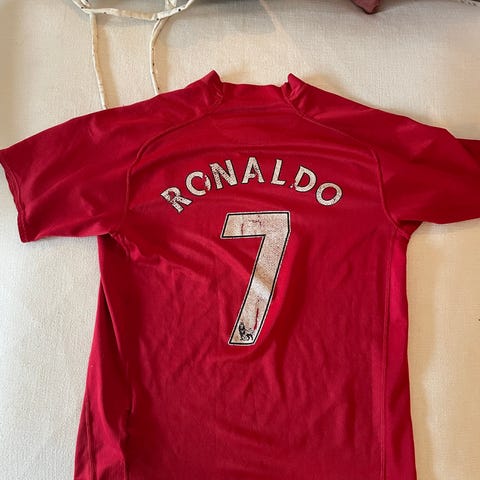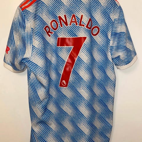 🤍Manchester United Cristiano Ronaldo 💙 fodboldtrøje i størrelse XXL til mænd. Trøjen har en blå og hvid mønstret overflade med røde detaljer, herunder logoer og nummer 7 med navnet Ronaldo på ryggen. Materialet er velegnet til sport, specifikt fodbold.