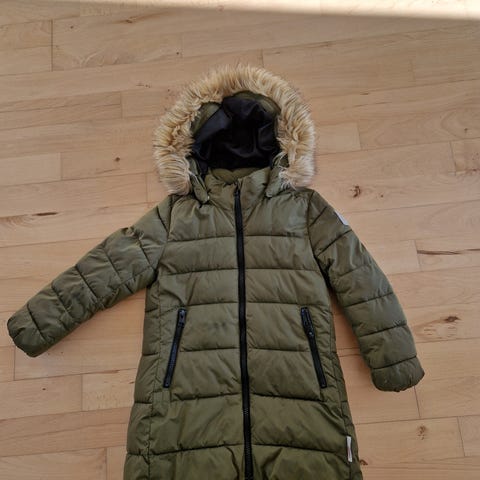 Reima børnejakke i størrelse 116 med grøn farve. Jakken har hætte med pelskant og er designet til børn.