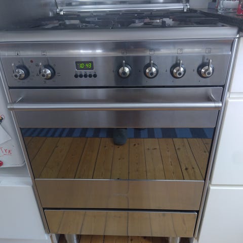 Smeg Gas Komfur med 4 blus, fremstillet i rustfrit stål. Komfuret har betjeningsknapper foran og inkluderer en metalrist til gryder og pander. Velegnet til madlavning med gas.