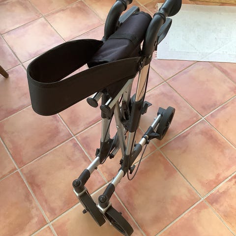 Actimo rollator med integreret sæde, ryglæn og opbevaringspose. Fremstillet i aluminium med fire hjul for stabilitet og nem manøvrering. Justerbare håndtag og håndbremser for sikkerhed og komfort. Velegnet til personer med behov for støtte ved gang og korte pauser.