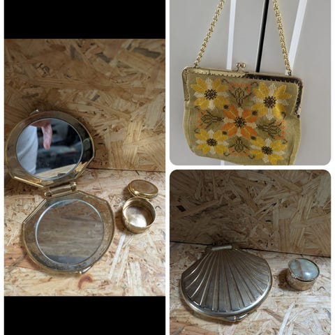Hvid vintage håndtaske fra 50erne. Den er med metal kant og med kæde som håndtag. De er i farven guld.