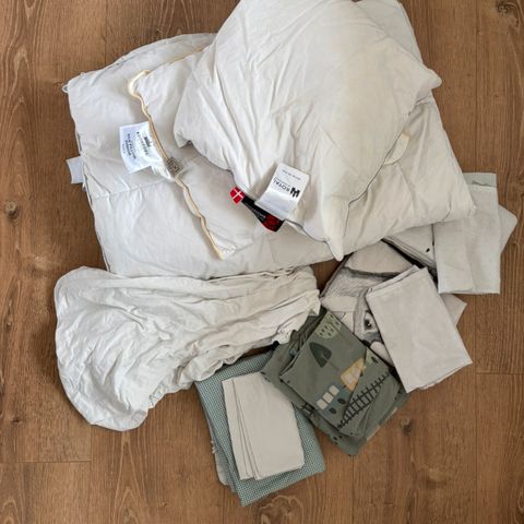 Så har jeg 2 fine junior andedunsdyner, 1 hovedpude og 2 x 2 dyne-og pudebetræk til salg for 450 kr. Sælges også enkeltvis.
