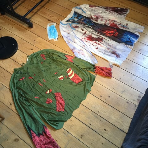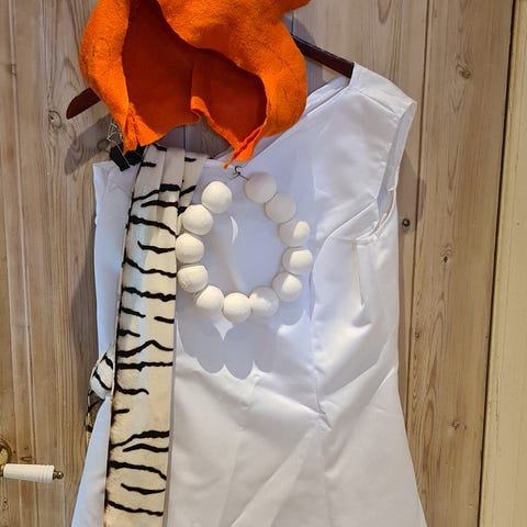 Wilma en hvid asymetrisk kjole. Til Wilma er der paryk, halskæde, armbånd og øreringe