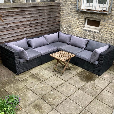 Havesofa med polstrede sæder og ryglæn i sort flet og grå hynder