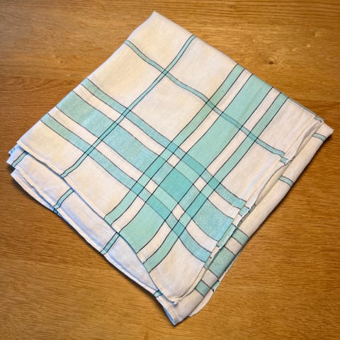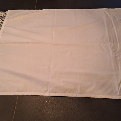 I råhvid formentlig silke. Har lidt pletter - tror det kan gå af. Den er virkelig smuk. Har størrelse som en stofserviet.