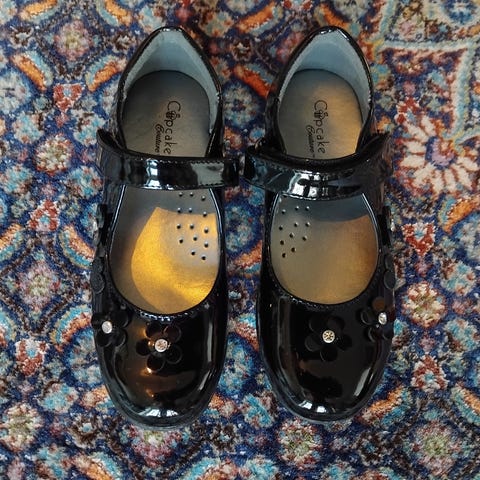 Børnesko til pige i størrelse 17 med sølvfarvet materiale. Skoene har en lukning med rem over vristen og en let design med rynkede detaljer foran.
