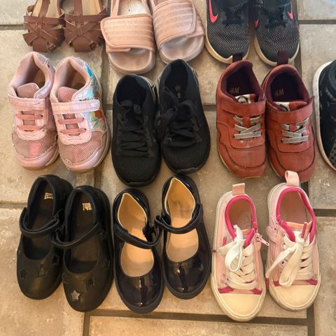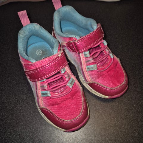 Børnesko til pige i størrelse 25. Farven er sort med lilla stjerner. Skoene har blød sål og er designet til indendørs brug.