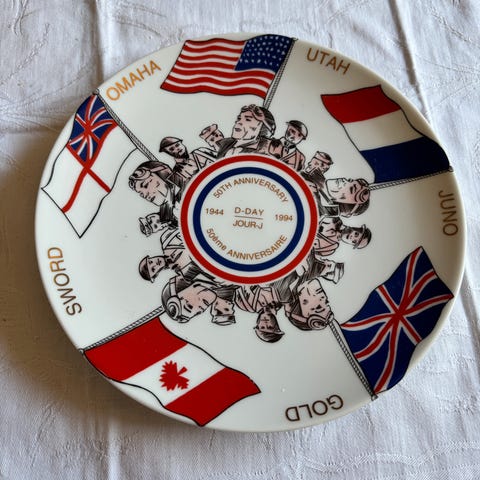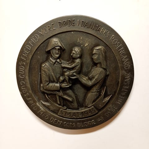 Danmarks Befrielse platte med motiv af to mænd der håndtrykker, symboliserende Danmarks befrielse. Medaljen er rund og lavet af metal med detaljeret relief. Bronze