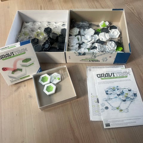 Gravitrax kuglebane med forskellige i plast. Sættet indeholder flere hexagonale byggeplader, ramper, kugler og andre tilbehørsdele til at konstruere kuglebane.