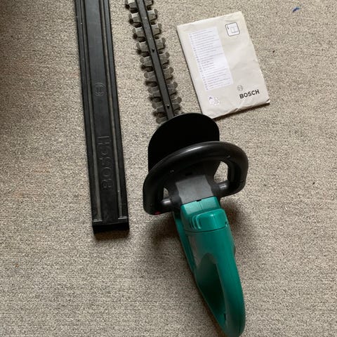 Bosch AHS 45-16 hækklipper med en klinge på 45 cm. Elektrisk drevet med ledning, velegnet til beskæring af hække og buske. Sort og blå farve, ergonomisk håndtag for bedre greb under brug.