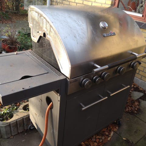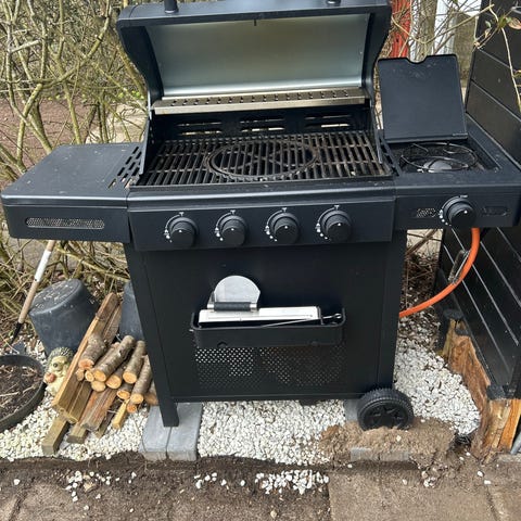 Bighorn gasgrill med tre brændere, sort farve og to sideborde. Grillen har et låg med håndtag og kroge til redskaber på siden. Egnet til udendørs madlavning. Brugt 3 gange. Nypris: 1.699kr. Med i prisen følger overtræk
