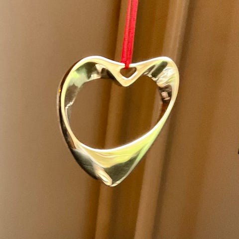 Georg Jensen Jul Dekoration i form af et hjerte med en flyvende fugl indeni. Fremstillet i metal med guld- og rød finish. Designet til julebrug som ophæng.