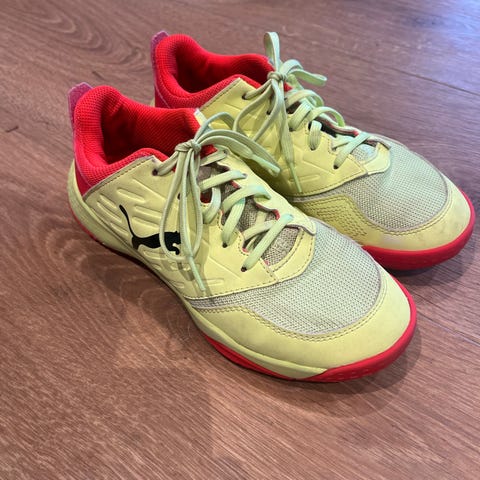 Puma indesko i størrelse 37 med hvid, pink og blå farve. Skoene er designet til løb og har en kombination af materialer for komfort og støtte. Som ny