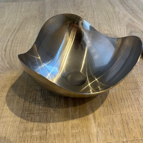 Georg Jensen sterling sølv serveringsskål med et bølget, organisk design. Skålen er fremstillet i poleret sølv og har en moderne, flydende form, der egner sig til servering af forskellige typer mad eller som dekorativ genstand.