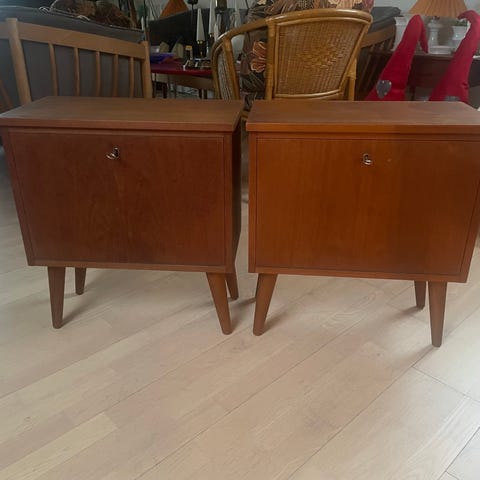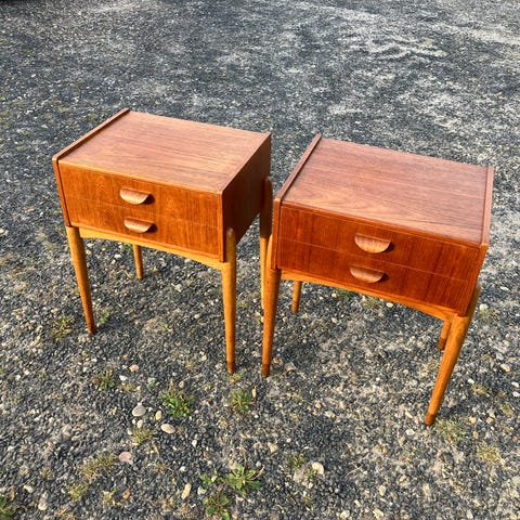 Et par sengebord i teaktræ med skuffe, stemplet model 140, fremstår i pæn brugt stand.