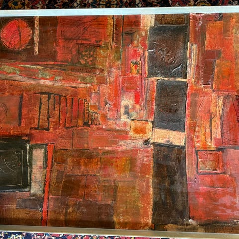 Smukt tryk af Kai Flummer i flotte farver i rød, lyserød, gylden gul, grøn beige i passepartout bag glas og ramme.