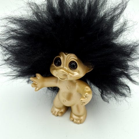 Lykketrold / Gjøl-trold / Dam-trold. En lille troldefigur med karaktistiskt hvidt hår. Figuren er kendt fra retro design og måler omkring 8,5 cm i højden. Det har ingen beklædning og er et populært samlerobjekt fra fortiden. Figuren er lavet af plast og er nem at kende på dens søde udtryk og karakteristiske stil. Denne type figurer blev ofte brugt som legetøj eller dekorative samleobjekter. Dens størrelse gør den nem at placere som dekoration på en hylde eller skrivebord.