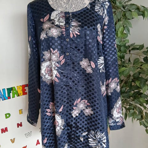 399. Elegant sort tunika med et blomstret mønster i gule og brune nuancer. Tunikaen har lange ærmer med knaplukning og en rund halsudskæring med en lille knaplukning foran. Et stilfuldt og behageligt stykke tøj.