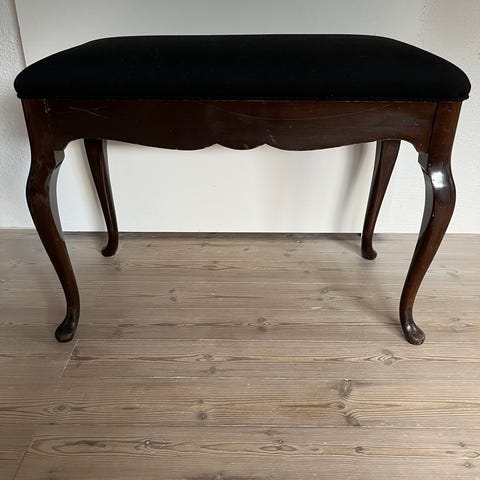 Lille fin klaverbænk eller bænk til entré eller gang. Mahogni med indlagt træ i sider. Diverse skrammer på ben, ellers pæn og velholdt i stof og sæde.