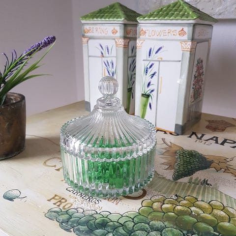 Bolche krukke med stribet bolche på låget råhvid/ sort fajance