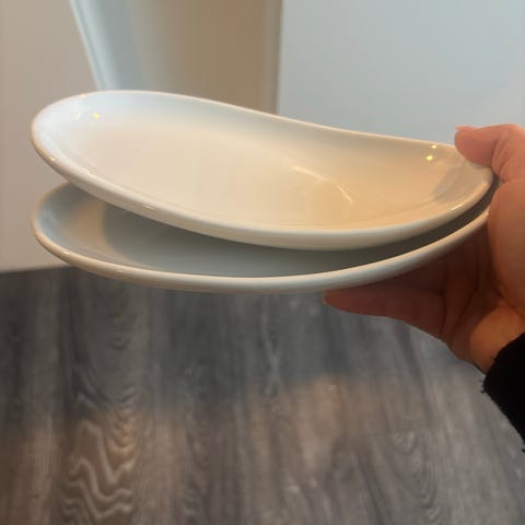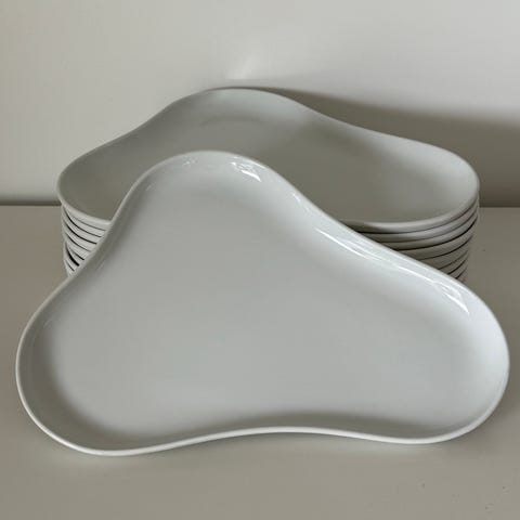 Ole middagstallerkner i hvidt porcelæn. Designet af Ole Jensen i 1997 for Royal Copenhagen.