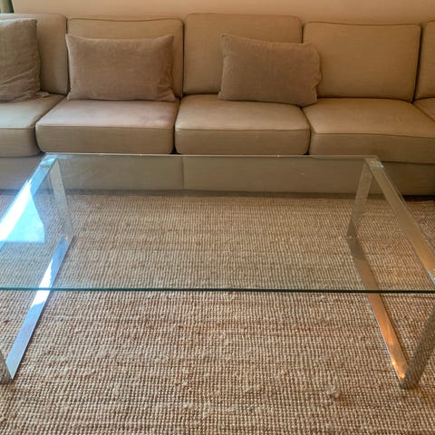 Har dette sofa bord til salg Det har også en mindre glas hylde der følger med Det er pt behandlet med mat skibslak, som giver en dejlig slidstærk overflade, og nem rengøring