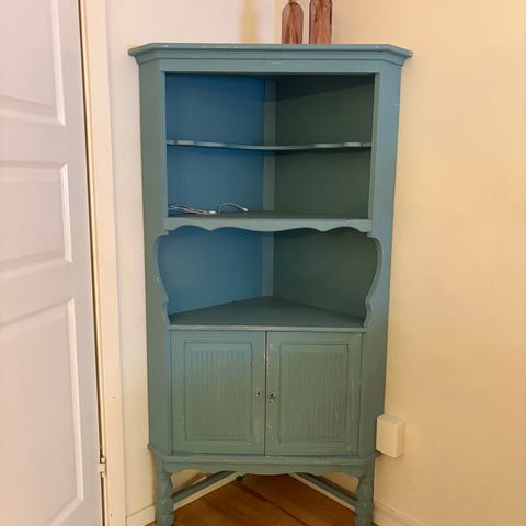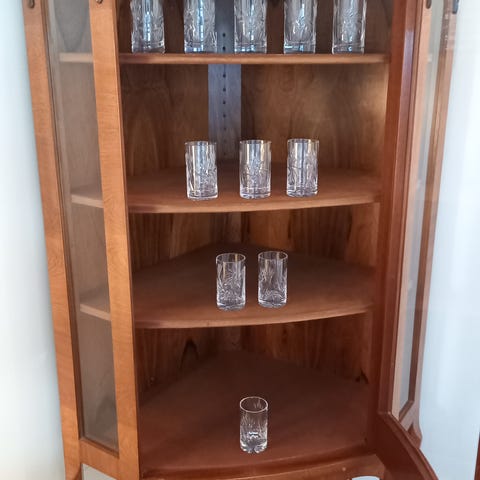 Træhjørneskab med glaslåger og hylder indvendigt. Skabet har flere rum til opbevaring og er designet til at passe ind i et hjørne. Fremstillet i træ med naturlig finish.