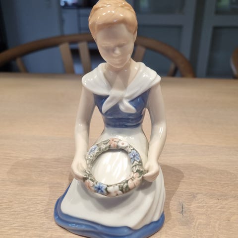 Bing & Grøndahl figur, der forestiller en pige iført en blå frakke. Figuren er lavet af porcelæn og har detaljeret maling. Den står på en rund base med naturinspireret dekoration. Produktet er dekoreret med Bing & Grøndahls mærke og modelnummer 3556 under bunden.