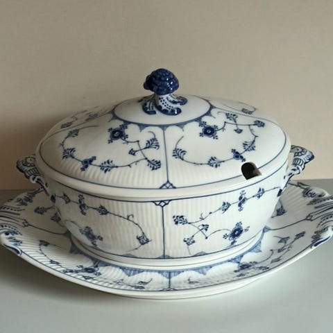 Terrinen er håndmalet med det karakteristiske blå riflet design, som har været en del af Royal Copenhagens historie siden 1775. Detaljerne er præcise, og det riflede porcelæn giver et levende og sofistikeret udtryk. Låget har det karakteristiske greb, og begge håndtag er smukt formede og dekorerede.