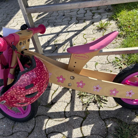 Mondo børnecykel med 12 tommer hjul, pink farve og sort kurv foran. Cyklen har støtteben, refleks bagpå og justerbart sæde. Virker som den skal. Egnet til små børn. Trænger til et ny saddel/saddelovertræk.