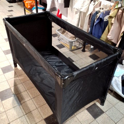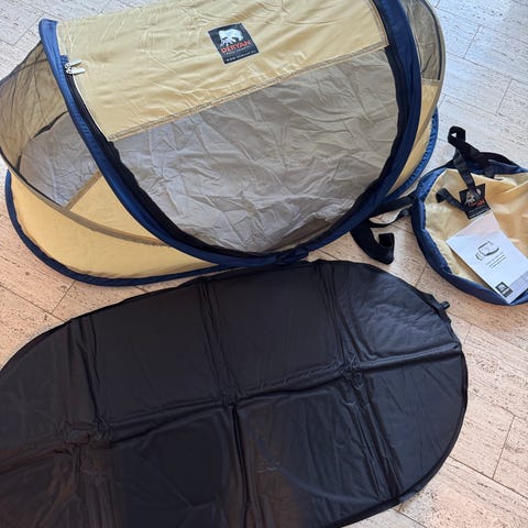 Rejseseng/rejsevugge, med myggenet. Kan foldes sammen så den fylder meget lidt.