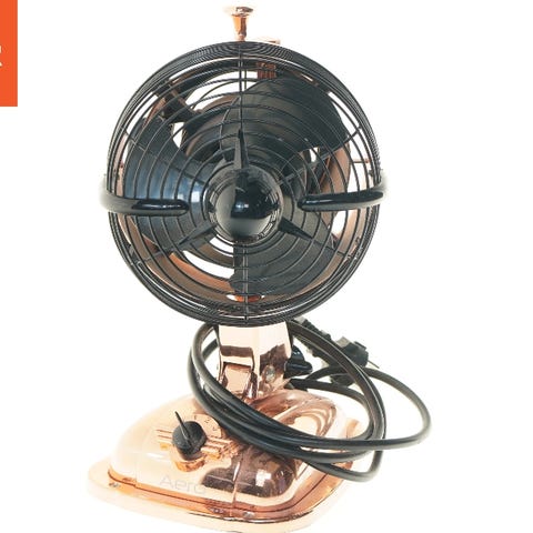 OBS: Den yderste beskyttelsesring mangler, og gitteret er sat fast med ståltråd. Ventilatoren er testet og virker uden mislyde, men er primært som en dekorationsgenstand.