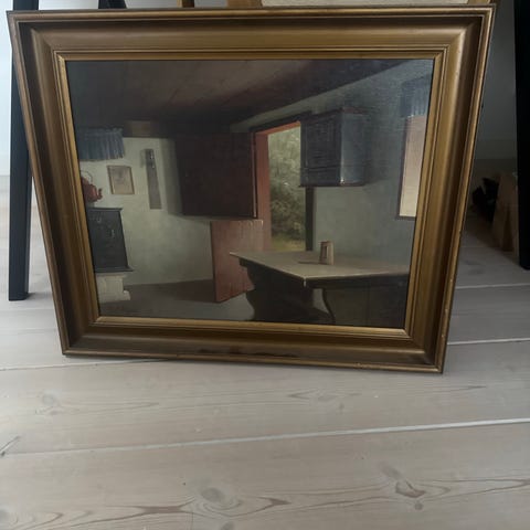 Maleri af indendørs rum med bord og vindue