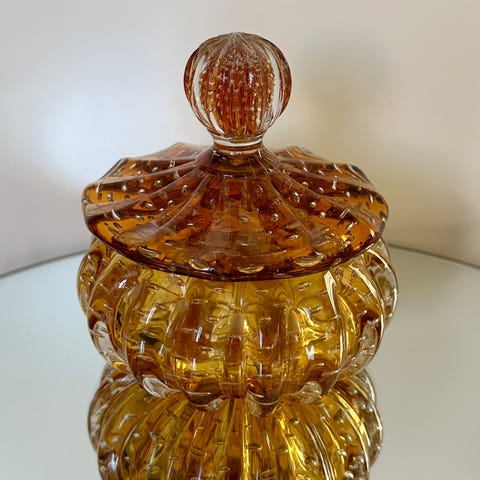 Vintage Murano glas Bonbonniere i lyseblåt glas med bubble Bullicante detaljer samt sølv i glasset for glanseffekt. Mål: ca. Ø: 14 cm. H: 12,5 cm.