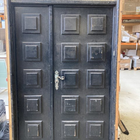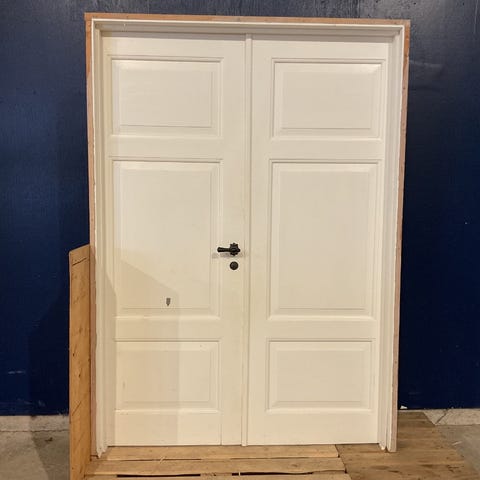Indvendig dobbeltdør 246x225cm i massivt egetræ med armeret glas, dørpumpe, sidepartier og sparkeplade. Hvert sideparti måler 40cm bredt. Døren har stået på dybkærskole. Har tydelige brugsspor og et defekt håndtag. Dimension: B: 246cm H: 225cm D: 11 Se evt. lignende artikler her: https://kingogenbrug.biz/vare/indvendig-doer-89x2115-cm-venstre/