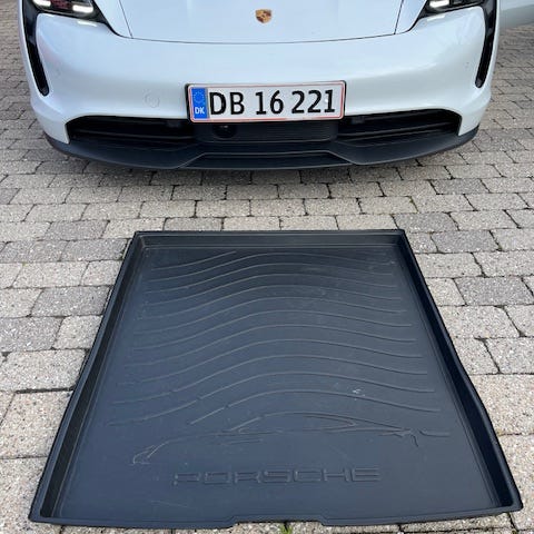 Porsche gummimåtter til bil og en Porsche opbevarings mappe til i kanten af sæderne. Måtterne er fremstillet i sort gummi og designet til at passe specifikt til Porsche Taycan. De har riller til effektiv opsamling af snavs og væske og er udstyret med fastgørelsespunkter for stabil placering i bilen. Opbevarings mappen kræver ingen fastgørelse, men er god til mobiltlf., nøgler og andre småting.