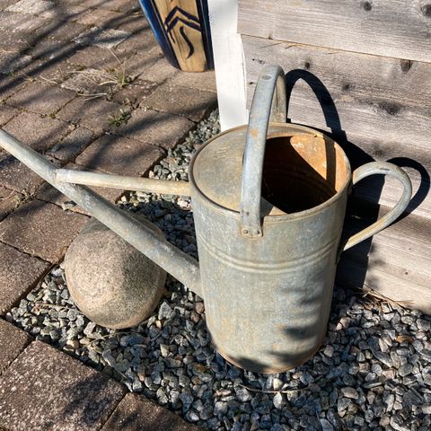 Til venstre: Højde inkl. hank: 45 cm. Diameter: 22 cm. Den har et boret hul i bunden, så den er beregnet til planter.