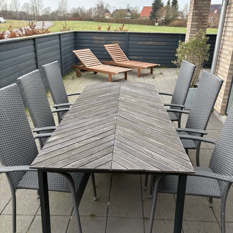 Havebord med seks stole.