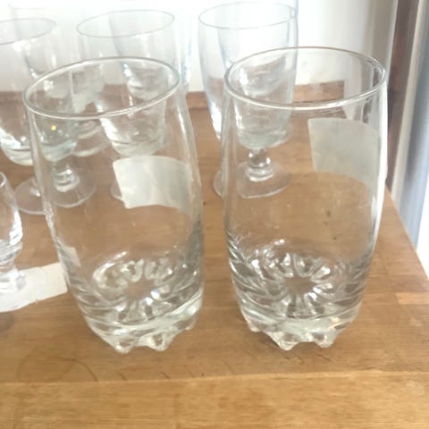 Holmegaard Glas Sæt bestående af 6 stk klare glas med 4 slebne striber. Glasene er fremstillet i klart glas omkring 1937 frem til 1960