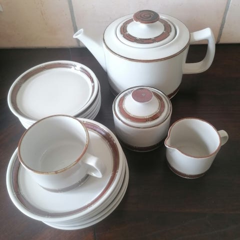 6 flade, 6 dybe, 1 sovseskål, 1 kartoffelskål, 1 stegefad, 1 the kande, 1 fløde kande, 1 sukkerskål, 6 thekopper, 6 underkopper og 6 kagetallerkner. Et rigtig flot flyt hjemmefra sæt. Evt. afhentning i 8752 Østbirk
