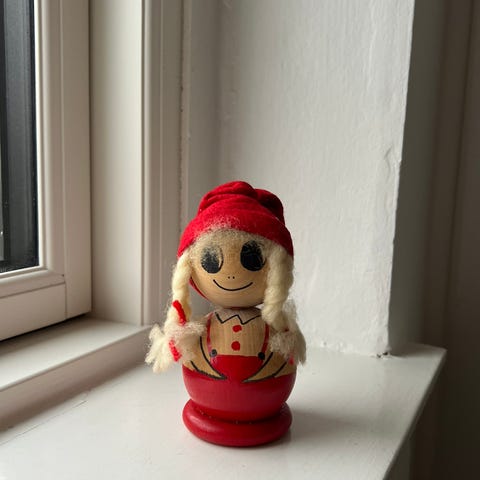 Nissepige og nissemor af malet træ.