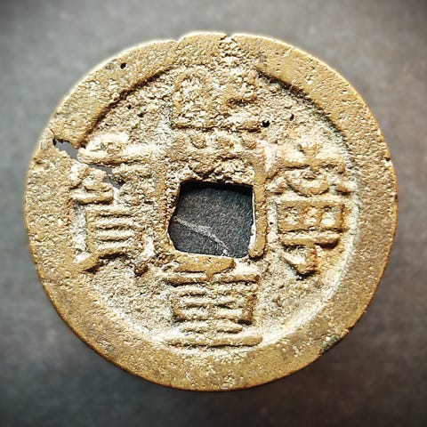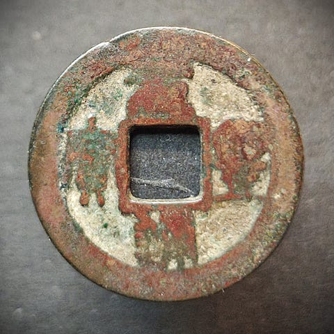 Betalingsmiddel: Fire antikke kinesiske knivmønter.