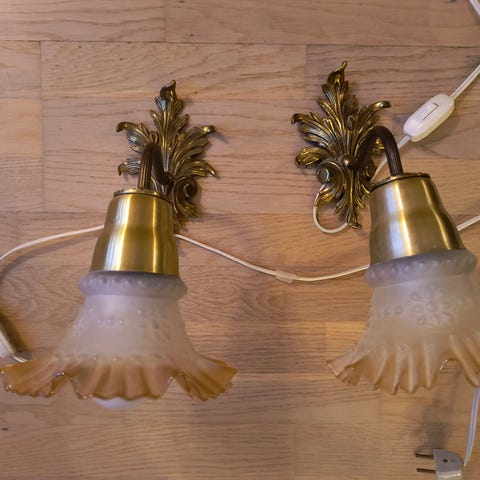 Smuk messingfarvet væglampe med matteret glas-skærm. Har stik og ledning, så den er lige til at tilslutte.