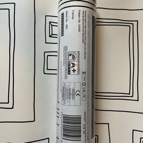 Ferm Living tapet med målene 0,53 meter i bredde og 10 meter i længde. Tapetet er sort med et grafisk mønster i hvid. Materialet er papirbaseret.