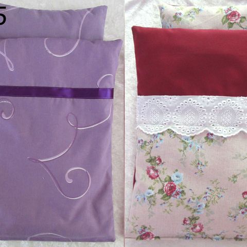 Dukke sengetøj. Passer til bl.a. Brio dukkevogn og Smallstuff seng. Til dukker på 40-45cm. Syet i bomuldsstof, bånd og fyld af krøyerkugler/ blødt fyld/ pladevat, så dukken/ bamsen sover godt ;). Dyne og pude er syet sammen forneden, så barnet ikke kan komme til fyldet. Måler ca dyne 28x36cm og pude 18x22cm.