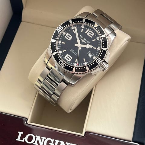 Longines svar på en submariner et gigantisk og legendarisk high end luksus ur mærke der har fortjent sin status der udelukkende laver luksus ure her er deres klassiske diver udgave model hydroconquest i sort, flot stand og fuld sæt købt i hvelplund på strøget boks inder / yder , manual og certifikat + ekstra led, uret går og virker ingen service historik men holder tid og går har ligget i samlingen små 2 år uden at blive brugt.
