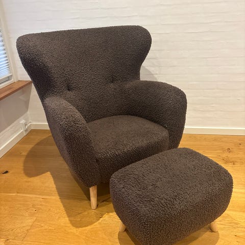 Da vi skal flytte i noget mindre, sælger vi vores grå lænestol med puf fra Ilva. Den har primært været brugt som pynt og står derfor som næsten ny.