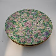 Smukt sæt på 8 stk. håndmalede kinesiske porcelænstallerkener i det klassiske “Bok Choy”/kålblad-mønster med små sommerfugle rundt i spejlet og et centralt shou-tegn (寿) for “lang levetid”. Flotte grønne nuancer (famille-verte/overglasur-emaljer) og guldkant.