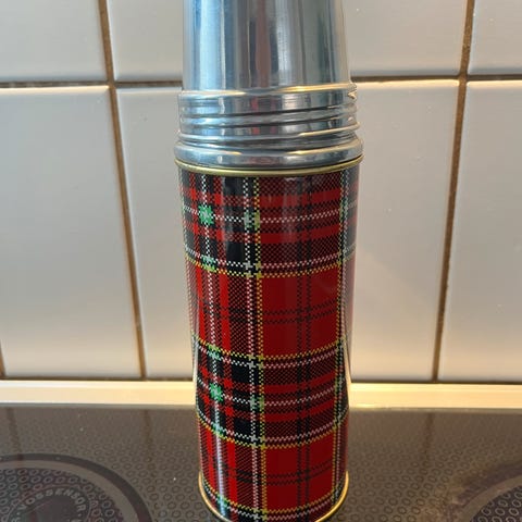 Fin ældre Thermos termokande med korkprop. Højde : 19 cm. Proppen er blevet hård og kan derfor ikke sættes helt ned i kanden. Men man kan godt ‘lukke’ kanden tæt. Alternativt kan du prøve at skære proppen til, så den passer. Kan sendes.