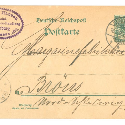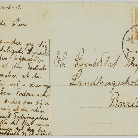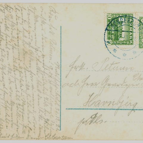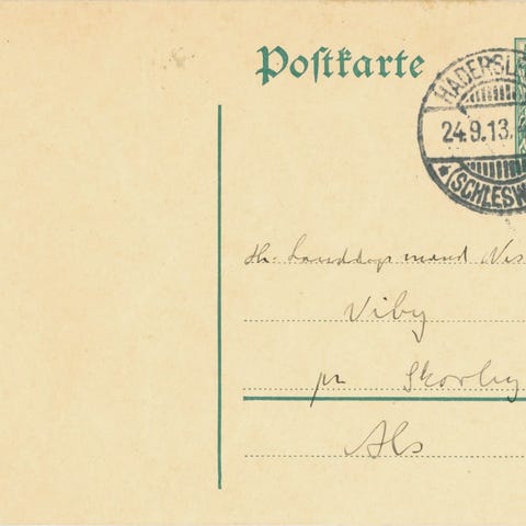 Postkort med bureaustempel Sønderborg-Nordborg d. 3.8.1928 T-11. Motivet er Augustenborg Slot. Desuden brev med indhold (med opskrift på morsom julekage) sendt til Halk ved Hejsager. Annulleret med det gode bureaustempel Sønderborg-Skovby d. 4.9.1920 T-11 Brevet blev lettere forrevet i højre side ved åbningen.